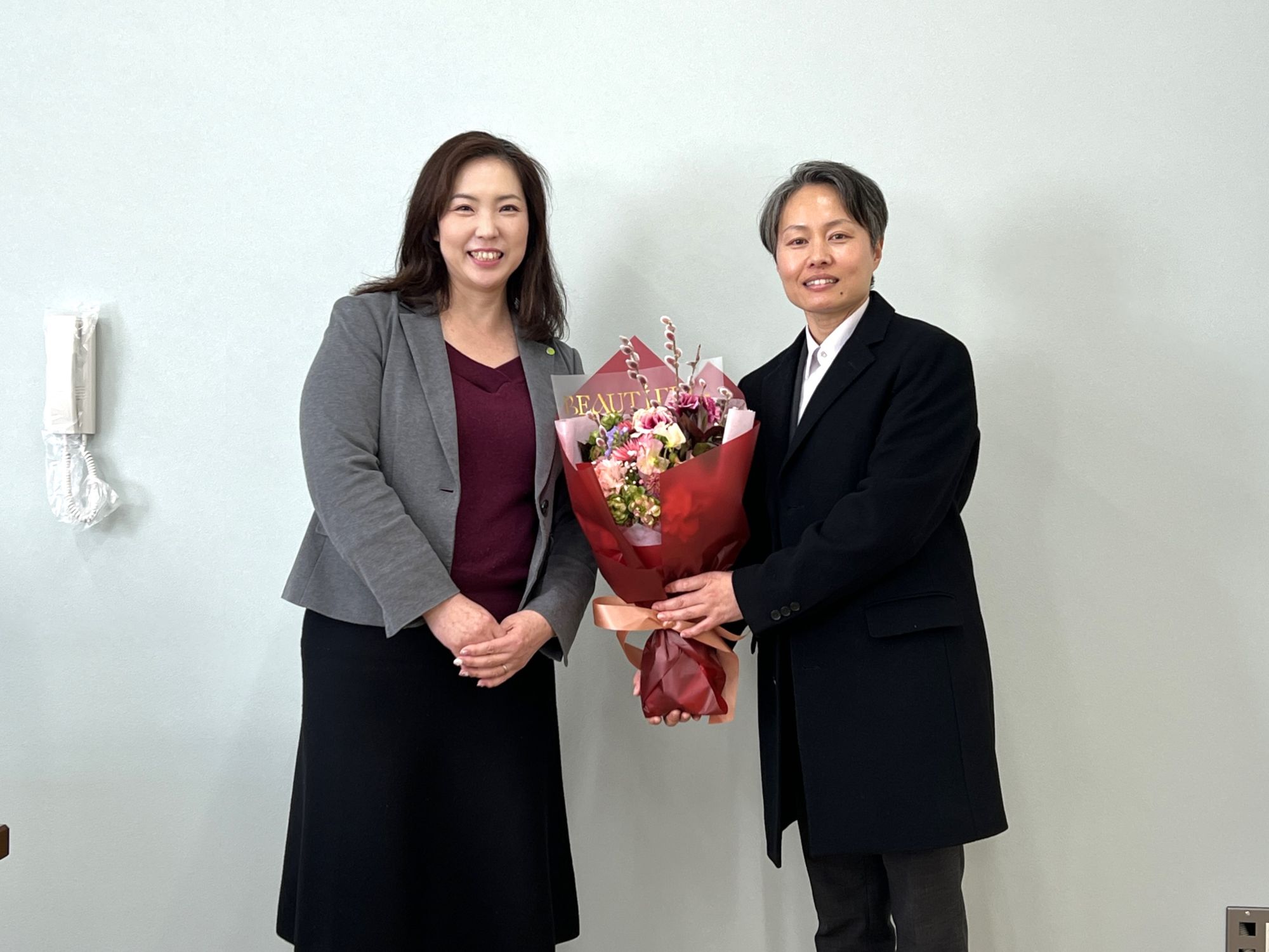 上瀬裕美町長は視察前日の2月12日(木)に就任・初登庁したばかりということもあり、藤井校長から就任お祝いの花束が渡されました。その後、教室や談話室、体育館など学校敷地内の見学を行いました。みえ大台おおぞら高等学校のスタッフと今後の開校や運営に向けて、意見を取り交わしました。