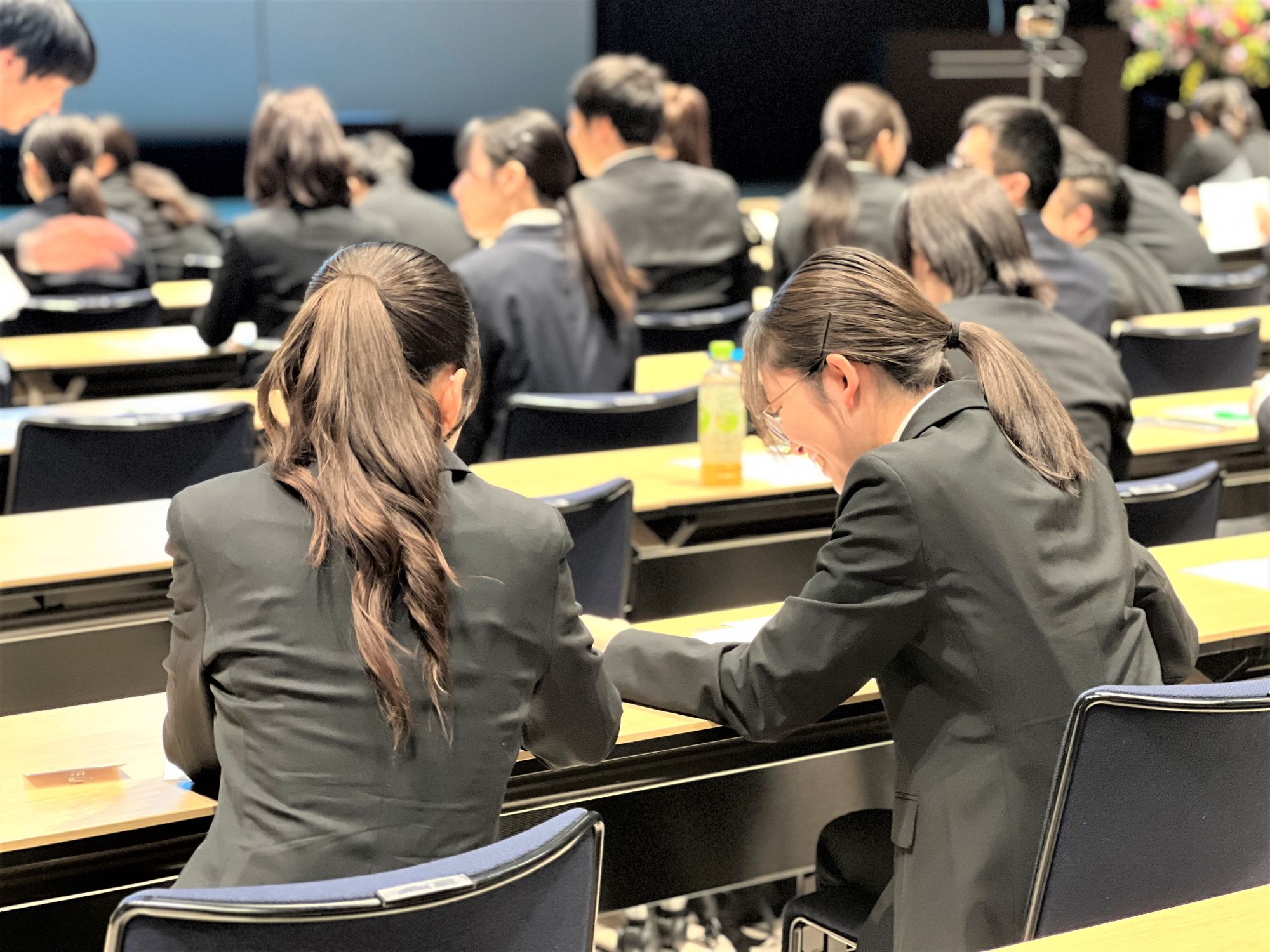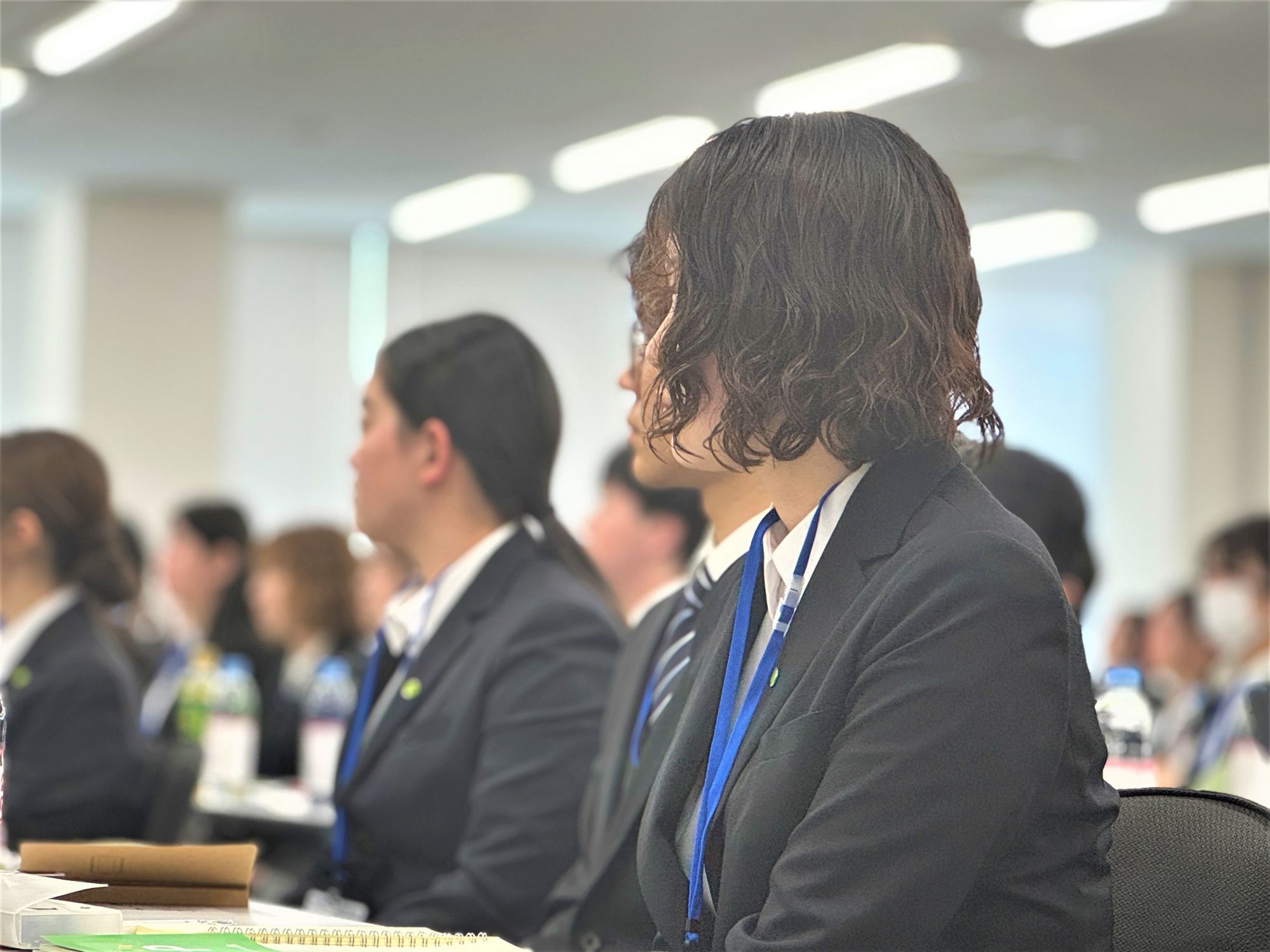 入社式の会場に集まった新入社員たちの表情は、緊張している人、ワクワクしている人、やる気に満ち溢れている人…とさまざまでした。冒頭は、新卒に向けて各事業部の代表から、社会人としての心構えや期待の言葉が伝えられました。新卒社員は真剣に耳を傾け、メモを取りながら聞いていました。辞令交付では、一人ひとりに辞令が渡されました。壇上に上がった新入社員の表情からは少しの緊張と「これから頑張っていこう」という決意が感じられ、頼もしささえ感じられました。式の後半になると緊張が少しほぐれた様子で同期同士が言葉を交わす場面も。これから共に成長していく仲間とのつながりが生まれていました。